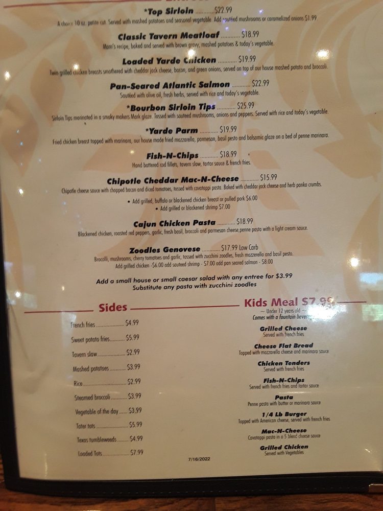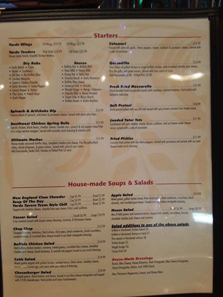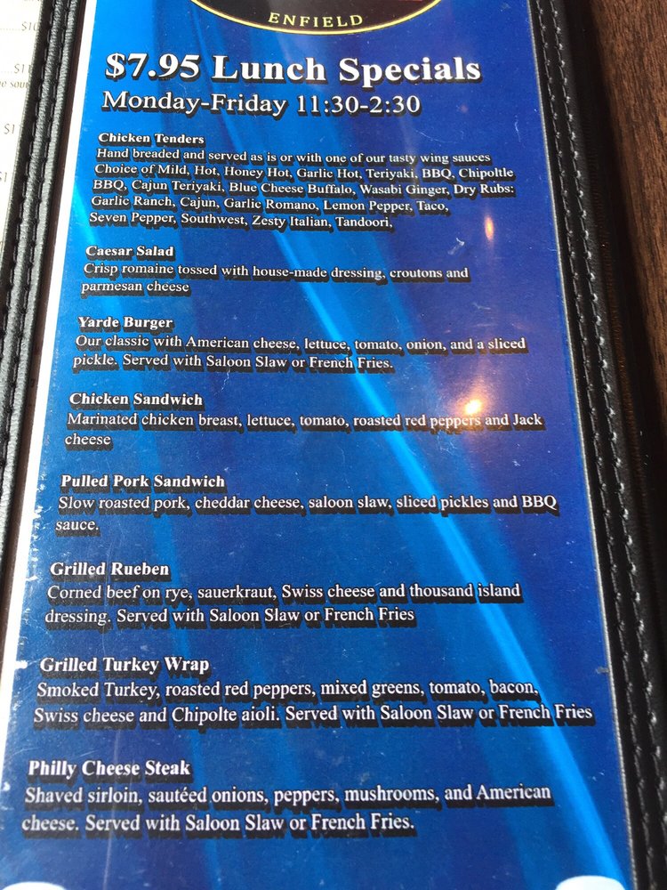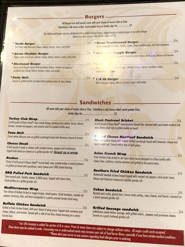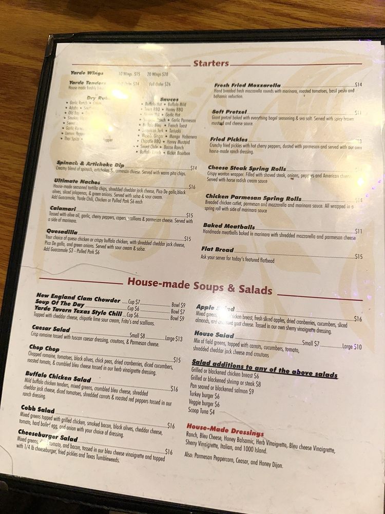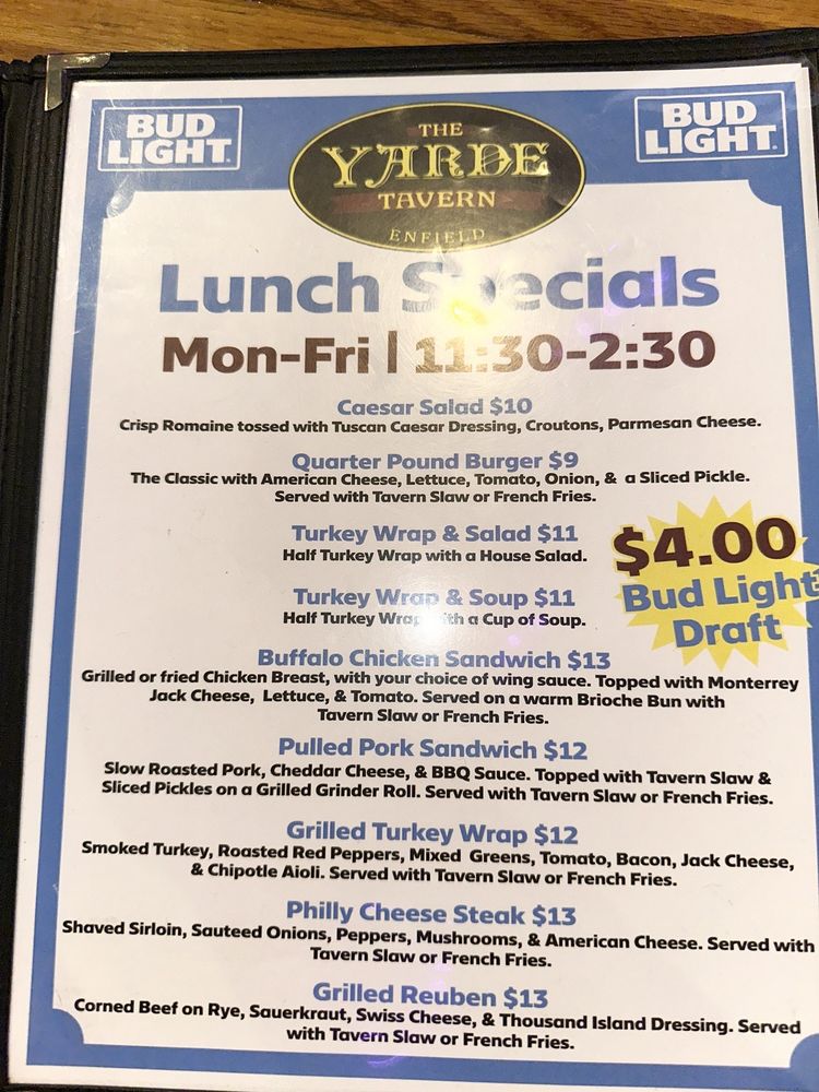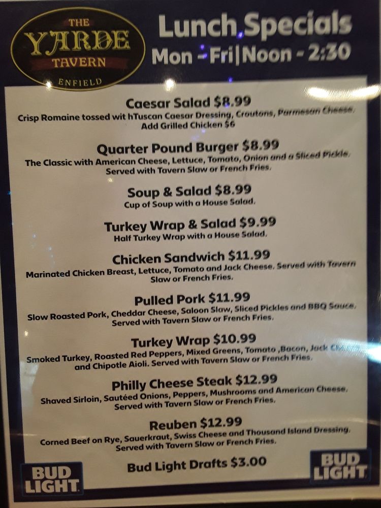 Introducing The Yarde Tavern: located in Enfield, CT, this American bar offers a variety of dishes suitable for vegetarians and features live music on Thursday, Friday, and Saturday nights. The menu includes flavorful salads like the Fort Worth Cobb and Crab Cake salads, mouthwatering sandwiches such as the Blue Burger, and house specialties like Filet and Enchilada and Japanese Salmon. Customers rave about the excellent customer service, fresh ingredients, and diverse beer selection. The casual atmosphere, outdoor seating, and attentive wait staff create a welcoming dining experience. With a focus on serving delicious food and providing a memorable dining experience, The Yarde Tavern is a must-visit spot for food and music lovers alike.